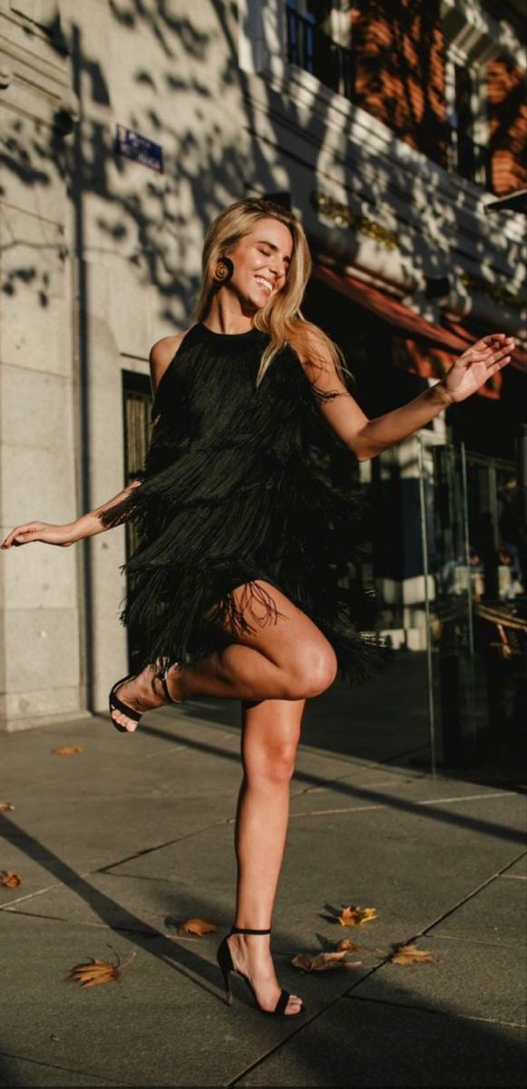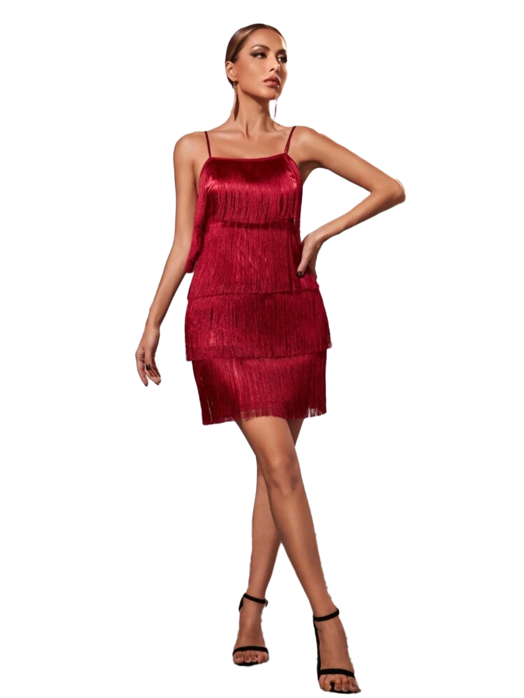 Vestido ajustado de tirantes con flecos a capas, de escote profundo